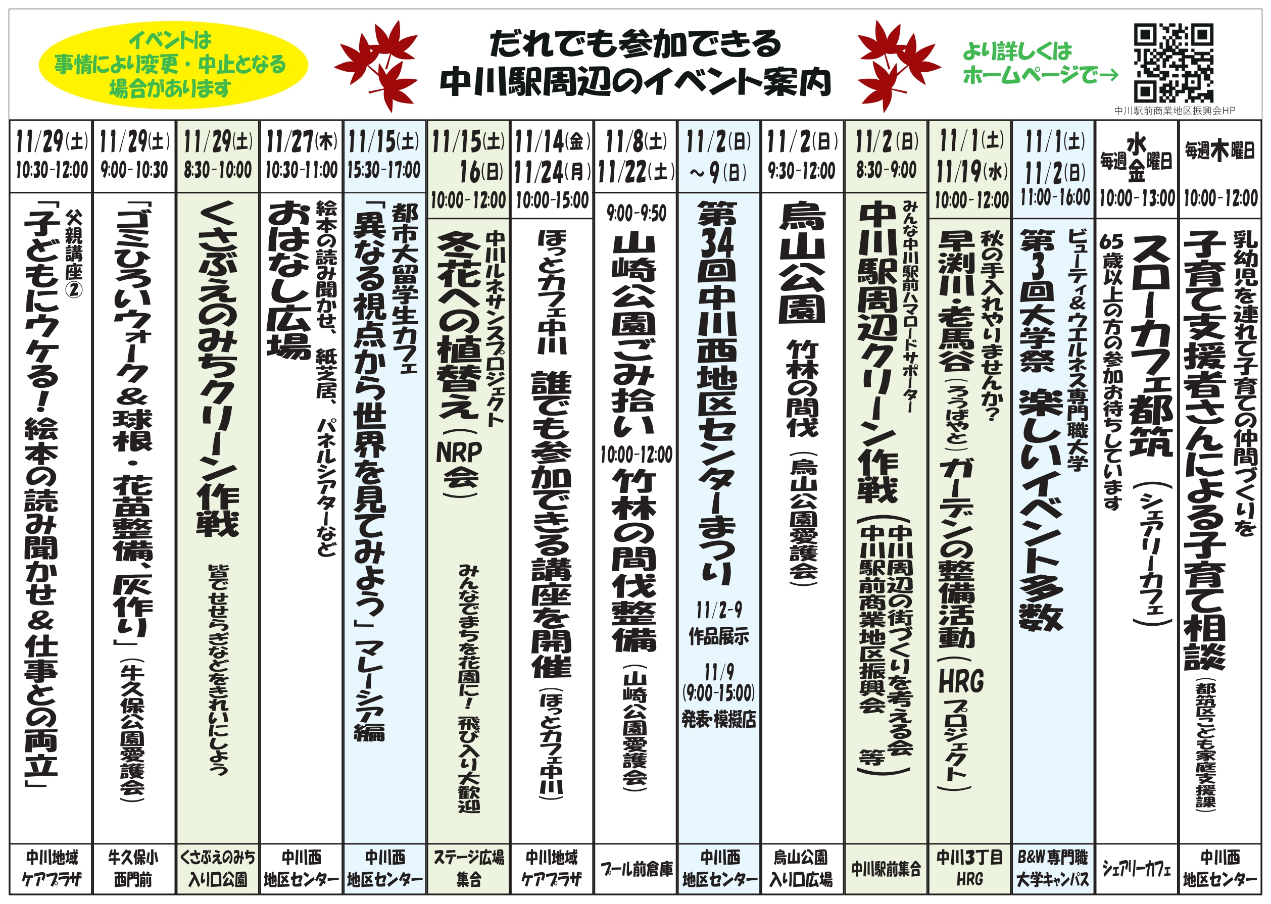 ホーム ☆山崎公園愛護会「トピックス」が更新されました。(2025/7/12)☆ぐるっと緑道の最新の広報が発行されました。(2025/7/2)☆山崎公園愛護会「イベントの案内」が更新されました。(2025/6/16)☆中川ルネッサンスプロジェクト「2025年活動報告」が更新されました。(2025/5/26)☆中川まちづくり連絡会「第8回中川まちづくり連絡会」が更新されました。(2025/5/10)☆山崎公園愛護会「今月の作業予定」が更新されました。(2025/5/7)☆烏山公園愛護会「年間活動計画」が更新されました。(2025/3/28)☆山崎公園愛護会「年間活動予定」「今月の作業予定」「山崎公園愛護会ニュース」が更新されました。(2025/3/28)☆早渕川老馬谷ガーデン「2025年前半のHRG活動予定表」が更新されました。(2025/2/5)☆中川駅前ハマロードサポーター「2025年 中川駅前クリーン作戦実施予定」が更新されました。(2024/12/8)☆牛久保公園愛護会「年間活動予定」が更新されました。(2024/5/14) 11月に行われる中川周辺の様々な団体によるイベント、活動スケジュールをお届けします。秋の楽しいイベントとボランティア活動がたくさん予定されています。やっと来た秋を楽しみましょう。 2025年11月4日 NEW! 広報 2025年11月2日 NEW! 【HRG】11/1(土)ネモフィラの種まき準備 2025年11月1日 NEW! 【HRG】早渕川・老馬谷ガーデン「コキア祭」実施 2025年10月31日 NEW! ホーム 2025年10月17日 【HRG】10/15(水)コキア祭準備大詰め 2025年10月17日 【HRG】10/11(土)ボランティア草刈り 「ぐるっと緑道」の活動紹介ムービー 中川のオリジナルソング「つながる “なかがわ”」MVつながる “なかがわ”