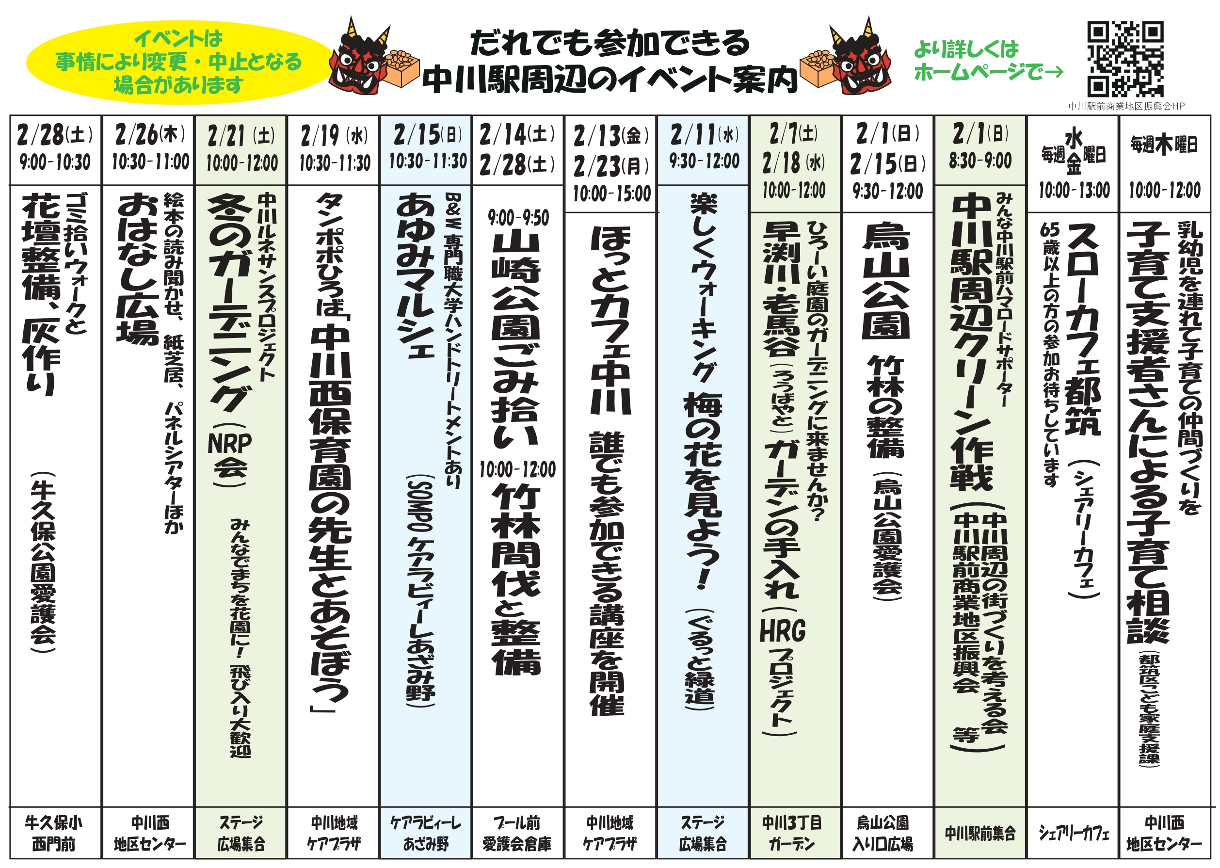 ホーム ☆山崎公園愛護会「トピックス」が更新されました。(2026/1/22)☆ぐるっと緑道の最新の広報が発行されました。(2026/1/4)☆山崎公園愛護会「イベントの案内」が更新されました。(2026/1/4)☆中川ルネッサンスプロジェクト「2025年活動報告」が更新されました。(2025/5/26)☆中川まちづくり連絡会「第8回中川まちづくり連絡会」が更新されました。(2025/5/10)☆山崎公園愛護会「今月の作業予定」が更新されました。(2025/5/7)☆烏山公園愛護会「年間活動計画」が更新されました。(2025/3/28)☆山崎公園愛護会「年間活動予定」「今月の作業予定」「山崎公園愛護会ニュース」が更新されました。(2025/3/28)☆早渕川老馬谷ガーデン「2025年前半のHRG活動予定表」が更新されました。(2025/2/5)☆中川駅前ハマロードサポーター「2025年 中川駅前クリーン作戦実施予定」が更新されました。(2024/12/8)☆牛久保公園愛護会「年間活動予定」が更新されました。(2024/5/14) 2月に行われる中川周辺の様々な団体によるイベント、活動スケジュールをお届けします。寒い日が続いていますが、2月4日は立春、もうすぐ春です。楽しい伝統行事やボランティア活動がたくさん予定されていますので、寒さに負けずご参加ください! 2026年2月1日 NEW! ホーム 2026年1月25日 【遊歩道】第4回定例美化活動実施 2026年1月23日 【HRG】新年の活動「新花壇作り」 2026年1月22日 山崎公園愛護会 2026年1月4日 広報 2025年12月28日 【自宅緑化】冬花のパンジーとビオラに植え替え 「ぐるっと緑道」の活動紹介ムービー 中川のオリジナルソング「つながる “なかがわ”」MVつながる “なかがわ”