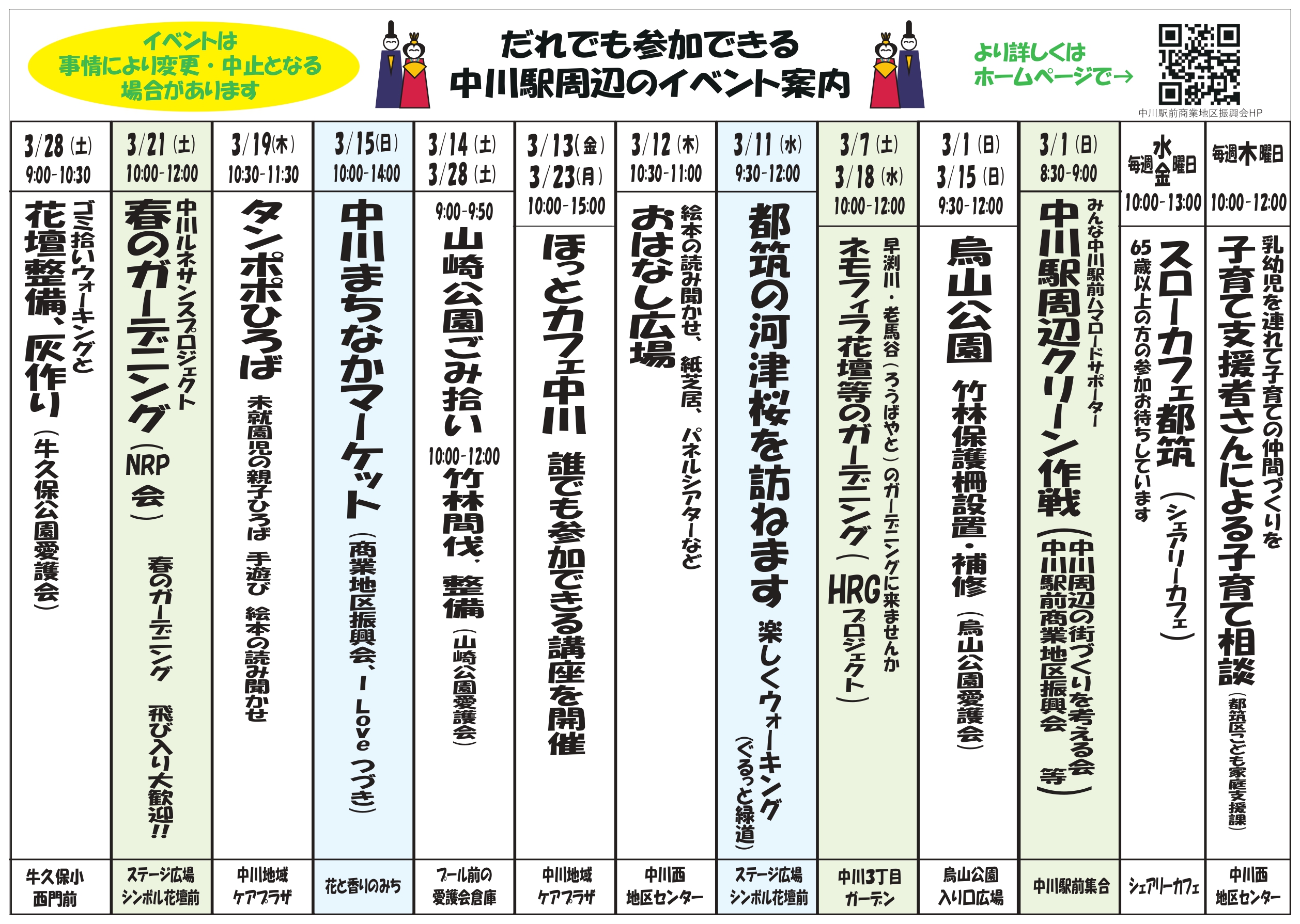 ホーム ☆ぐるっと緑道の最新の広報が発行されました。(2026/3/3)☆山崎公園愛護会「トピックス」が更新されました。(2026/1/22)☆山崎公園愛護会「イベントの案内」が更新されました。(2026/1/4)☆中川ルネッサンスプロジェクト「2025年活動報告」が更新されました。(2025/5/26)☆中川まちづくり連絡会「第8回中川まちづくり連絡会」が更新されました。(2025/5/10)☆烏山公園愛護会「年間活動計画」が更新されました。(2025/3/28)☆山崎公園愛護会「年間活動予定」「今月の作業予定」「山崎公園愛護会ニュース」が更新されました。(2025/3/28)☆早渕川老馬谷ガーデン「2025年前半のHRG活動予定表」が更新されました。(2025/2/5)☆中川駅前ハマロードサポーター「2025年 中川駅前クリーン作戦実施予定」が更新されました。(2024/12/8) 3月に行われる中川周辺の様々な団体によるイベント、活動スケジュールをお届けします。春がやって来ています。桜など花木がつぎつぎと咲いていきます。楽しいイベントやボランティア活動がたくさん予定されていますので、ご参加ください。 2026年3月6日 NEW! ホーム 2026年3月2日 NEW! 広報 2026年3月2日 NEW! 牛久保公園愛護会 2026年2月23日 【遊歩道】第2地区花壇の春先の手入れ 2026年2月19日 【HRG】ネモフィラの防霜シート外し 2026年2月7日 【HRG】擁壁花壇の枕木保全と剪定 「ぐるっと緑道」の活動紹介ムービー 中川のオリジナルソング「つながる “なかがわ”」MVつながる “なかがわ”