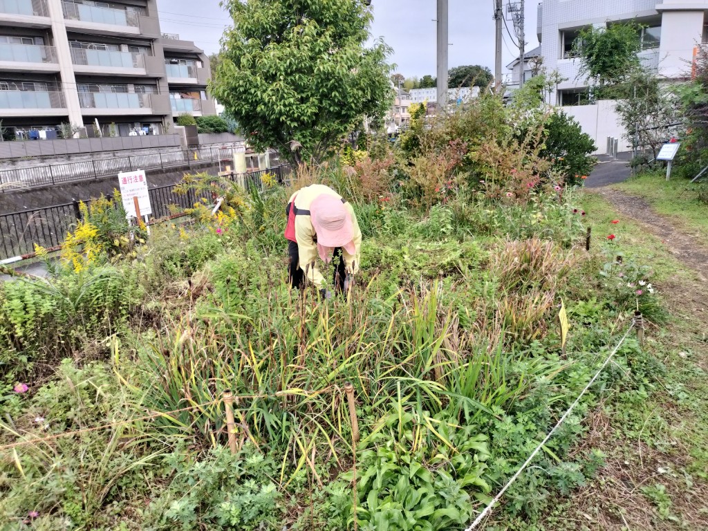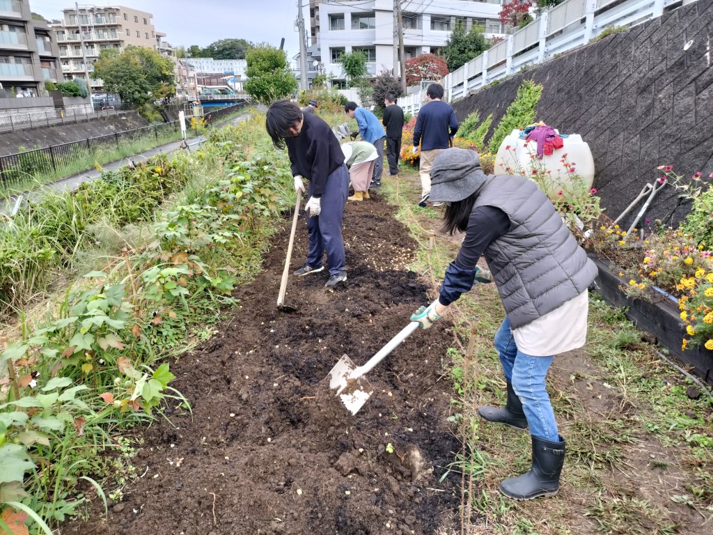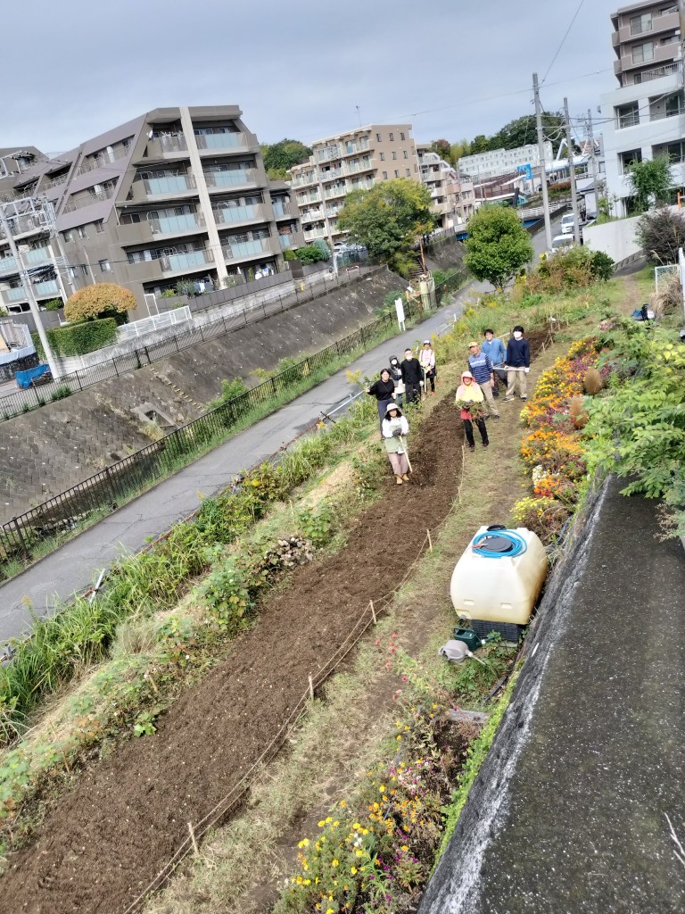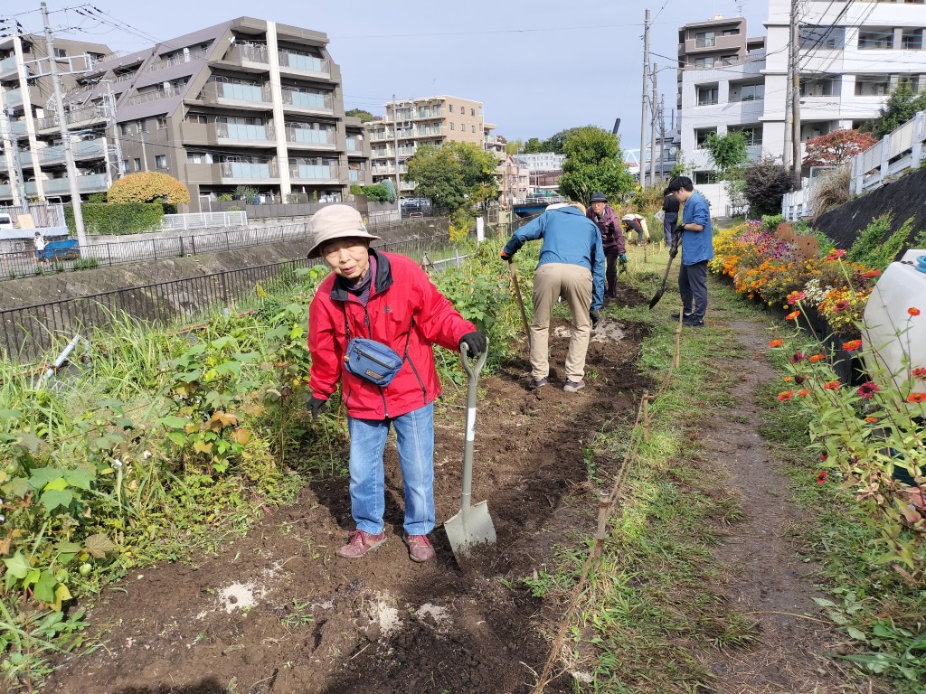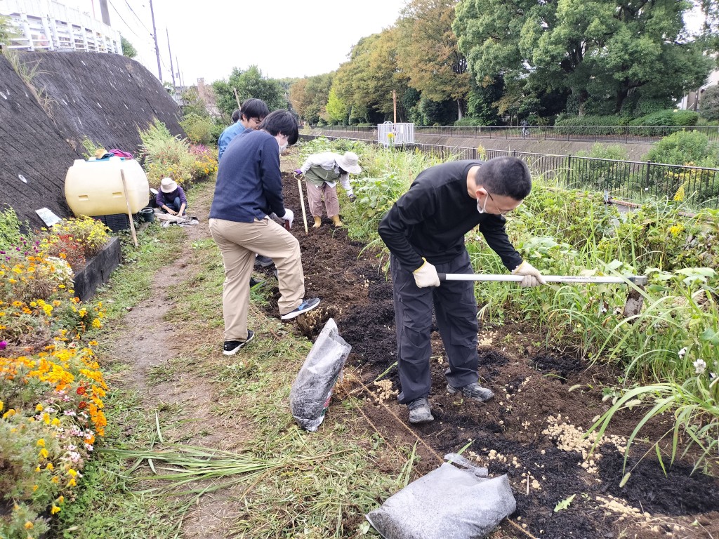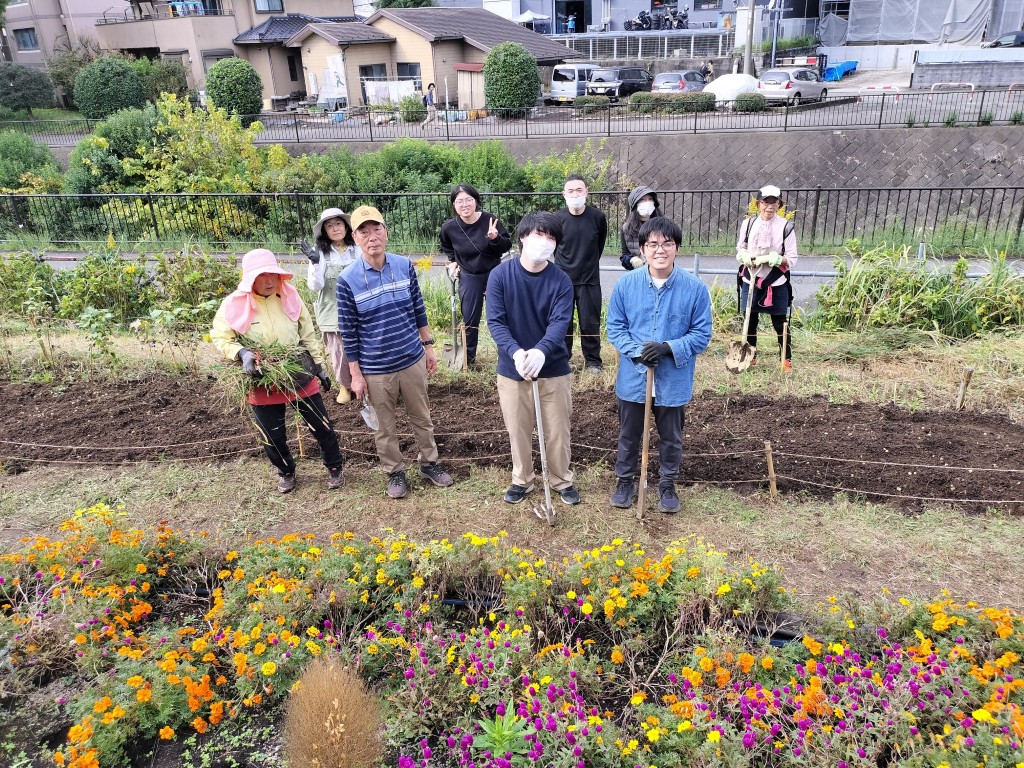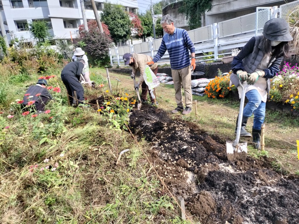 11月1日(土)、9時から11時までの住民9人と都市大都市緑化研究会学生4人が参加して、園路花壇にネモフィラの種まきを行うため、コキアを抜き取り、花壇の土を耕し、腐葉土、苦土石灰などを混ぜ込みました。広い花壇を耕すのは大変ですが、大勢が参加し、会話をしながら楽しく予定通りの作業ができました。