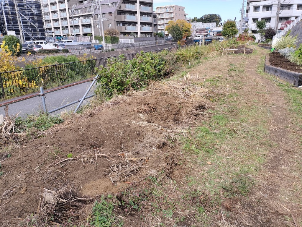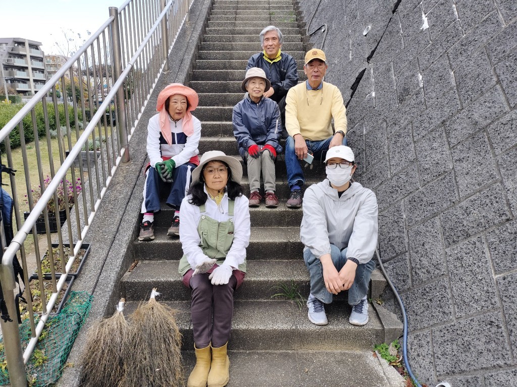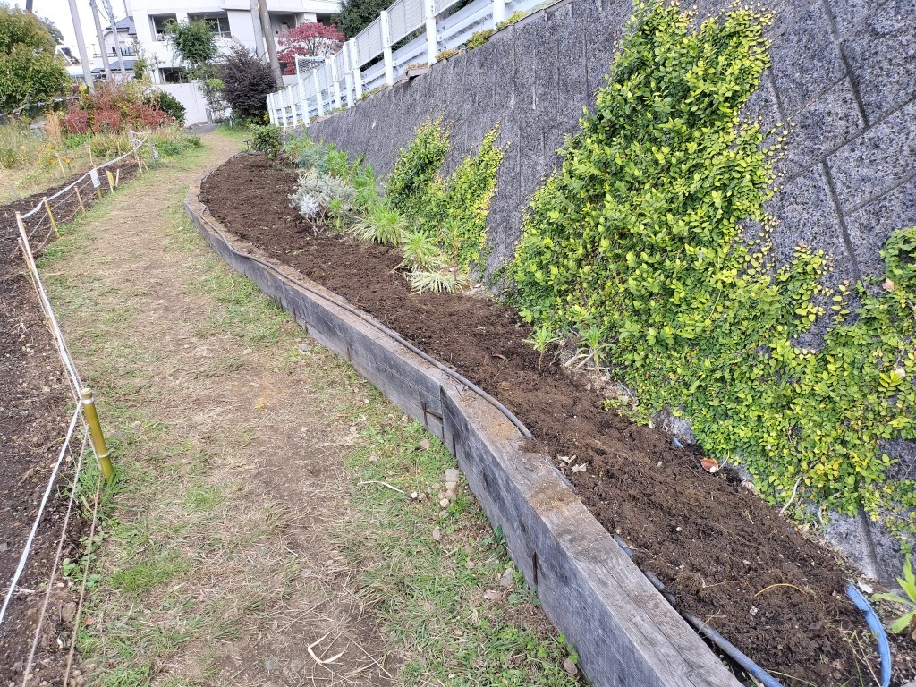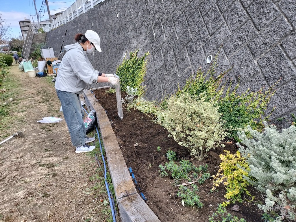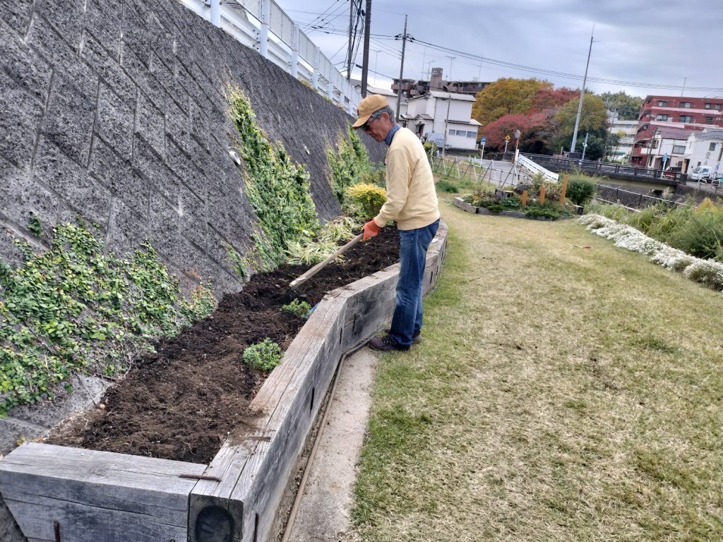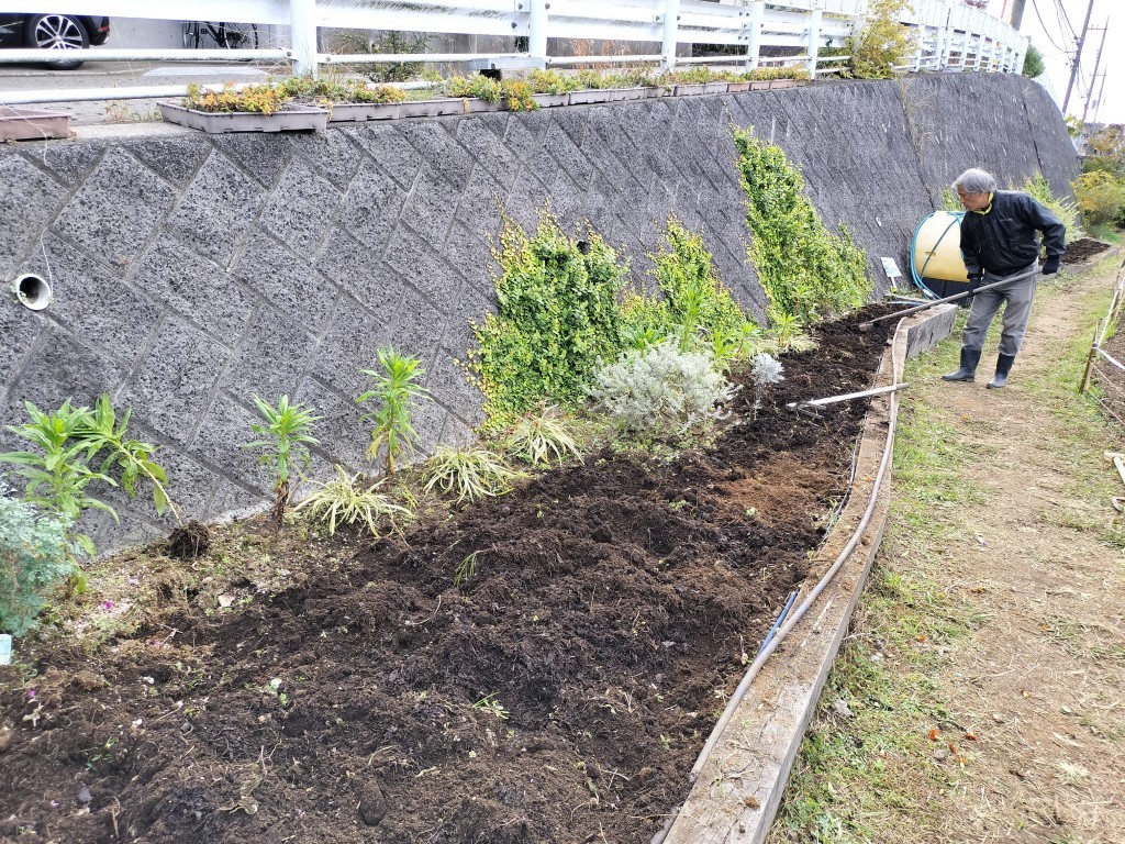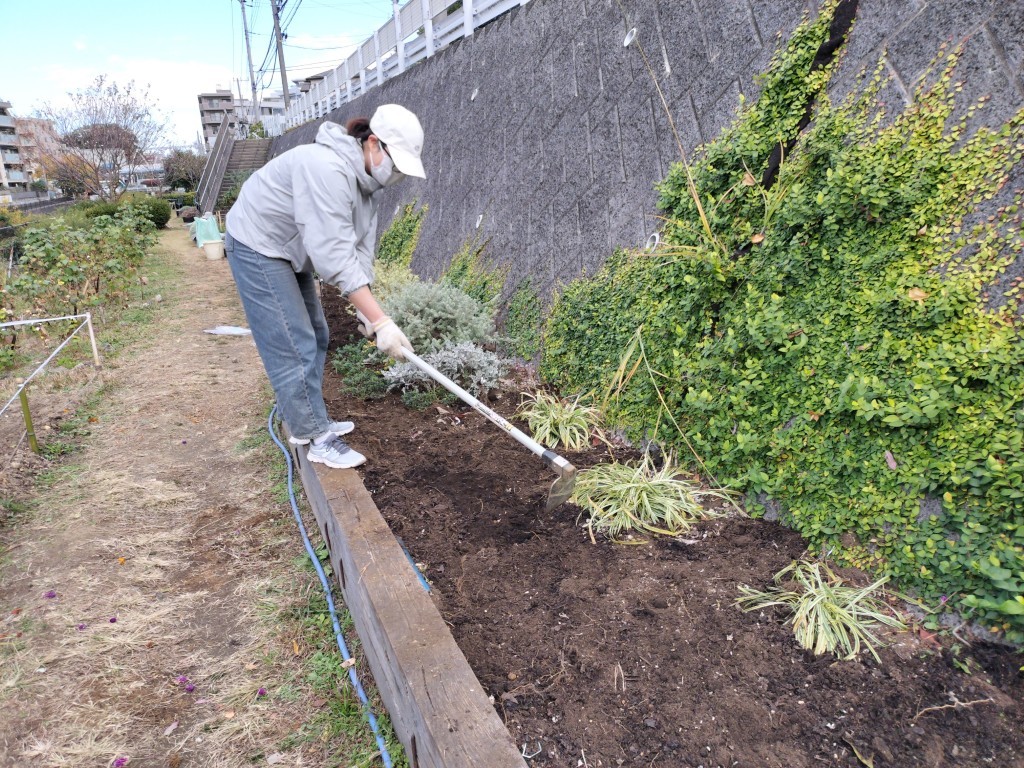 11月19日(水)、10時から住民7人とグループホーム「都筑の春」のベトナム人従業員のヒエンさんが参加して、擁壁花壇(4か所)にネモフィラ苗を植える為に夏花を抜き、腐葉土を入れてに土づくりを行いました。また、ブルーベリーの木に施肥をしました。