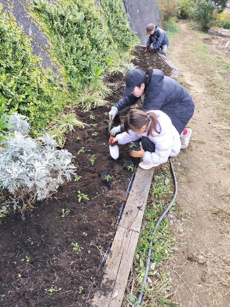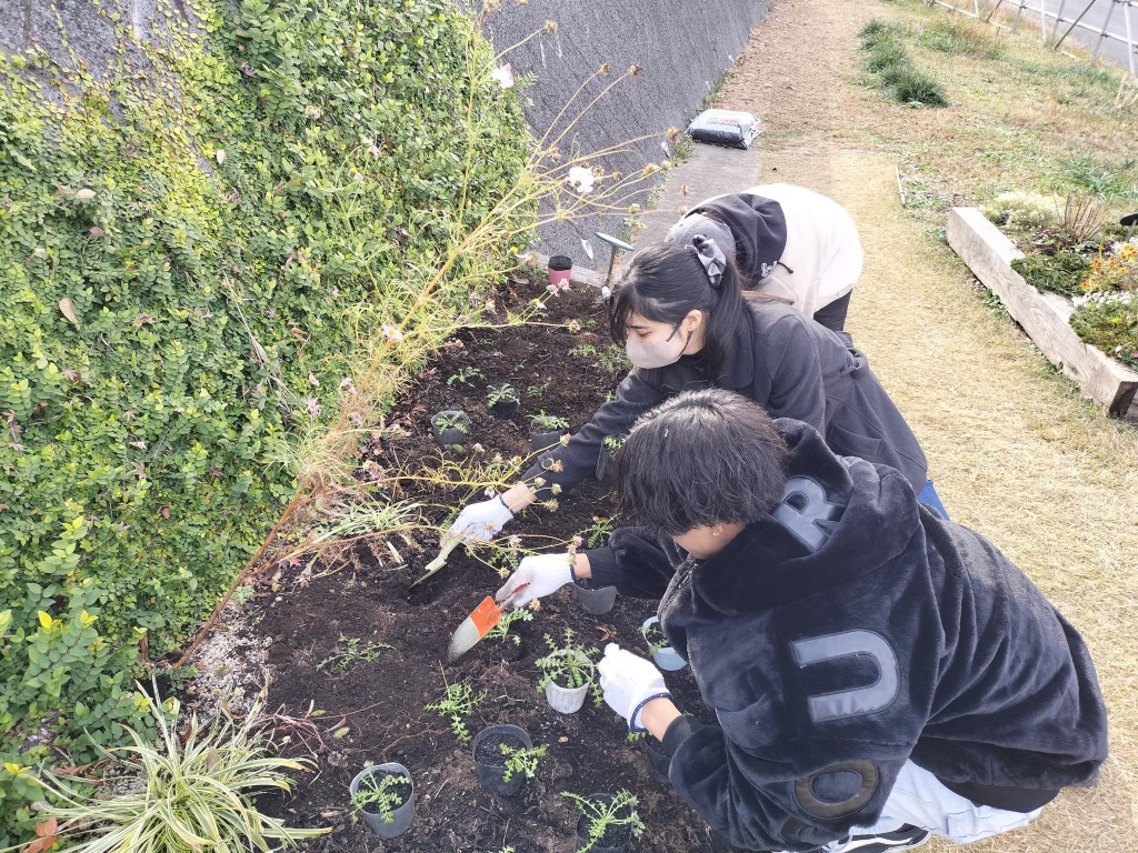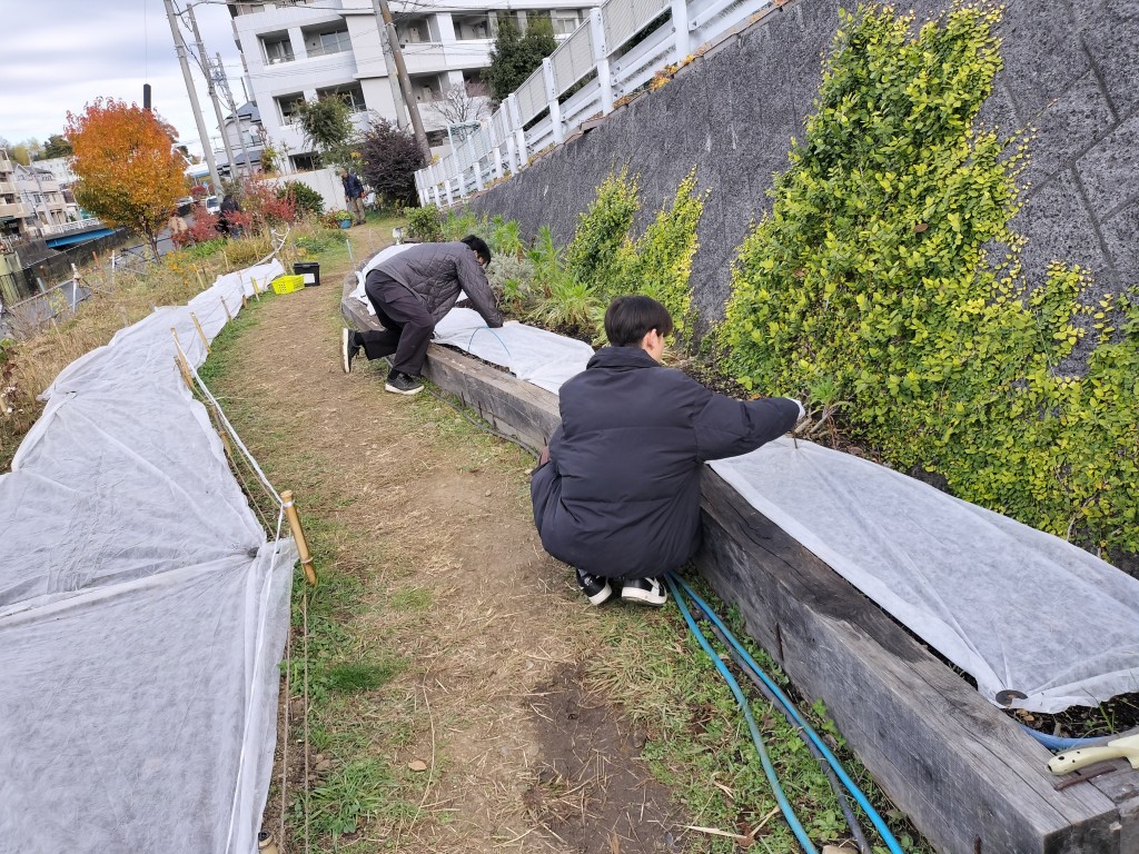 園路花壇などに直播をしたネモフィラの種が発芽、成長しています。これからの霜が心配なので飯島研の学生が不織布を敷設しました。