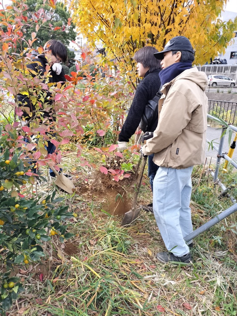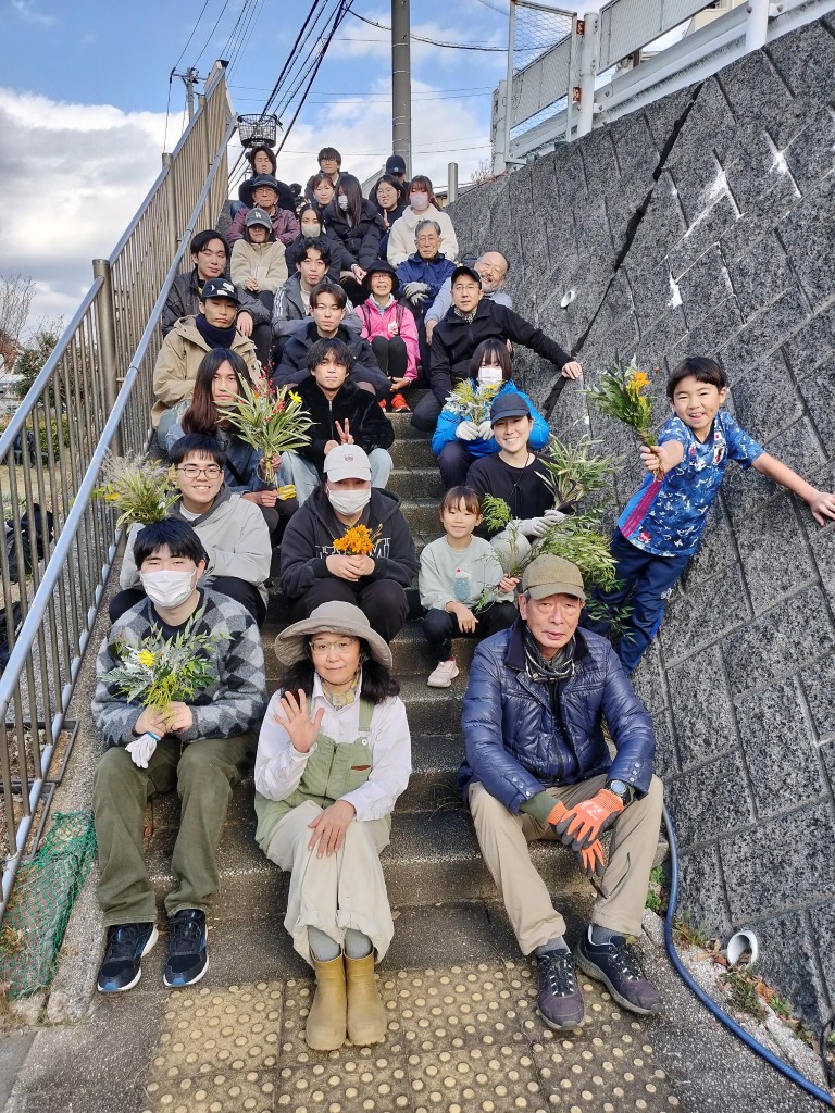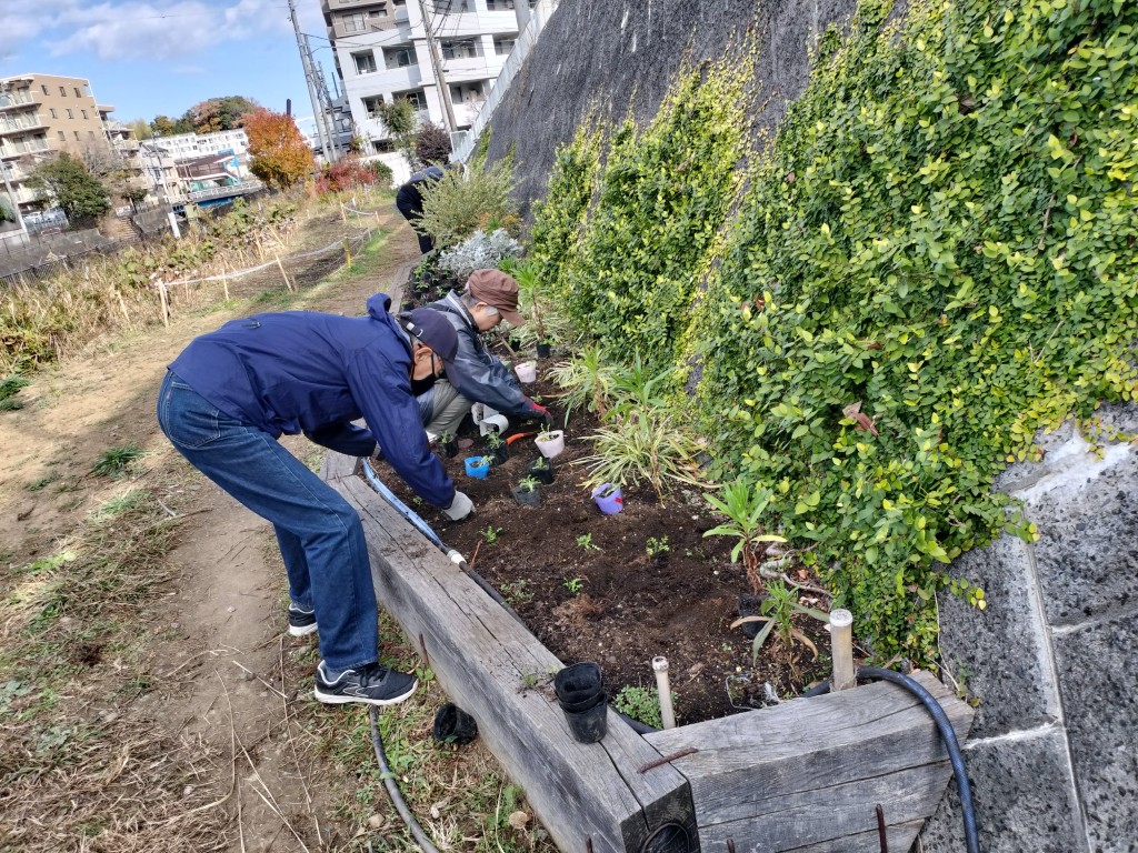 12月6日(土)、10時から住民、グループホーム「都筑の春」のベトナム人従業員、都市大都市緑化研学生と飯島研究室学生と造園家の菅さん等30人が参加して、擁壁花壇に約400株のネモフィラ苗を植える等の作業を行いました。3月の開花が楽しみです。