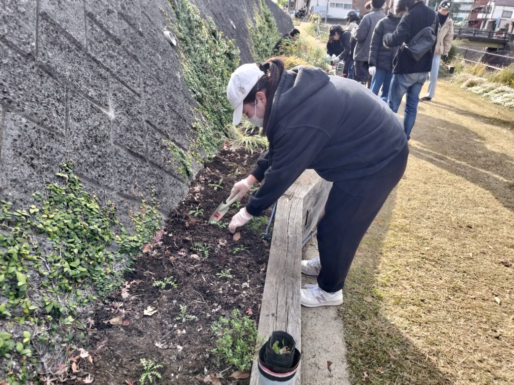 参加者全員で、2人のメンバーの家で育てたネモフィラ花苗約400株を擁壁花壇に植込みました。