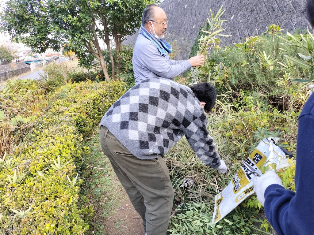 飯島研の学生が不動尊口の不要となった低木の伐根を行い、地域住民はアジサイ垣根の草刈りを行いました。