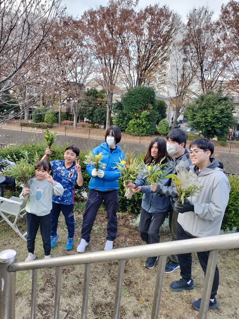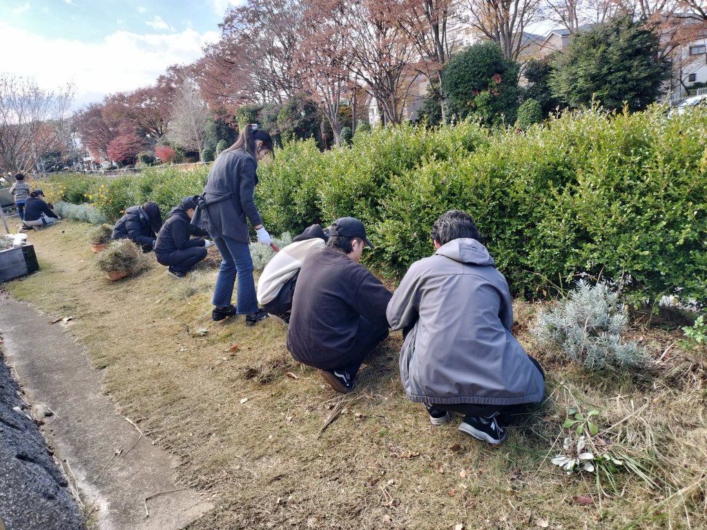 都市緑化研の学生は、造園家菅さんの指導を受けながら、階段花壇などの多年草の剪定、山野草エリアの笹、マリーゴールドなどの剪定を行い、エリアがスッキリしました。剪定した笹などはゴミにせず、花束に仕上げました。
