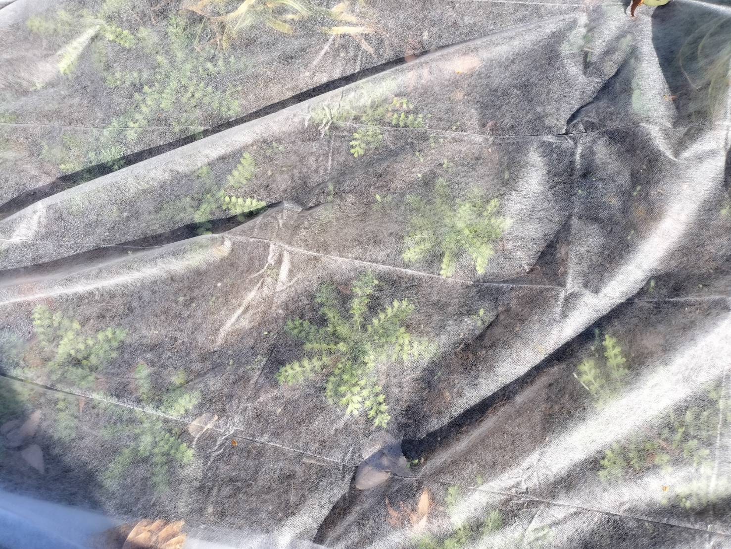 たくさん植えられたネモフィラは凍結防止シートの中で順調に成長しており、3月末からの開花が楽しみです。