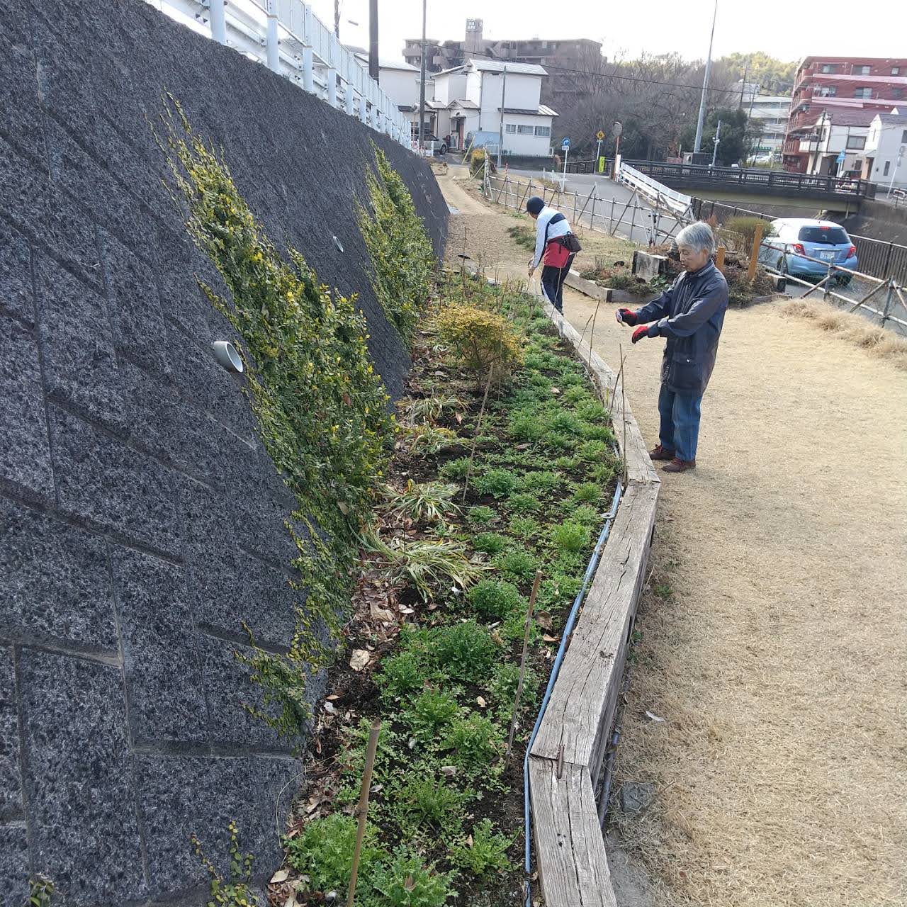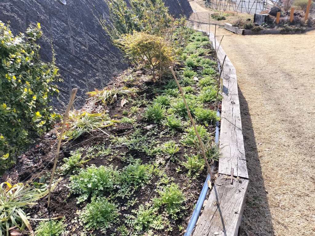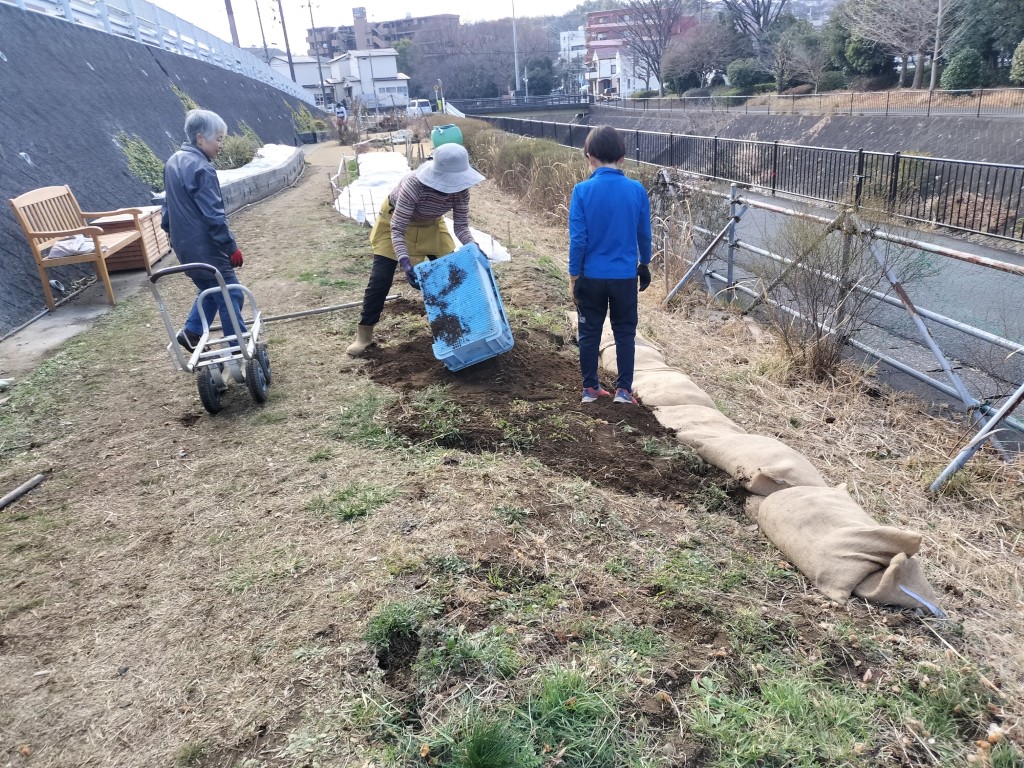 前回の不動尊側園路工事で発生した残土を鍛冶橋側に運び新たな花壇を作りました。元気な小学生が土の運搬をしてくれ大助かりでした。できた花壇には次回ネモフィラの苗を植える予定です。