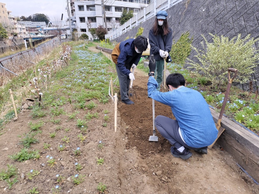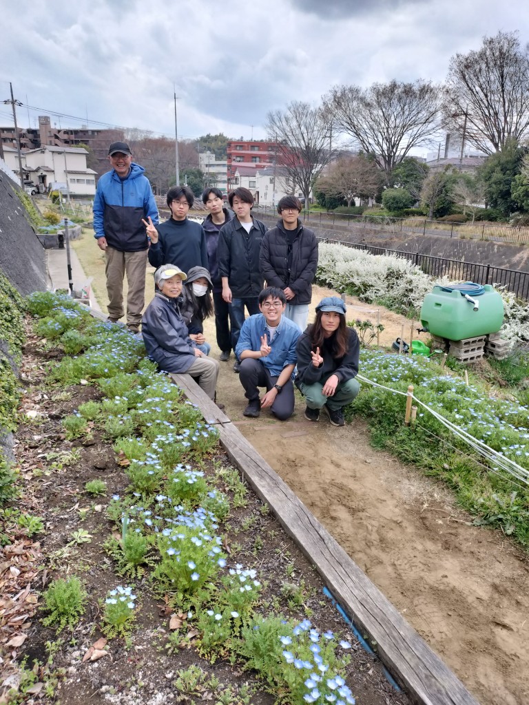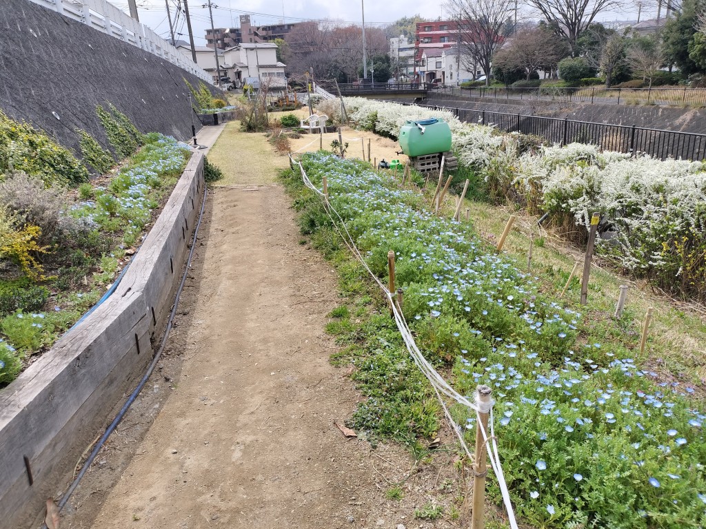 【HRG】ネモフィラ祭に向けて整備 - Category - HRGの活動報告 3月18日(水)、10時から住民5人と都市大生6人(都市緑化研究会、ISO委員会、飯島研究室)が参加して、月末のネモフィラ週間に向けて園路と鍛冶橋口花壇の整備を行いました。学生の力で園路がとても歩き易くなりました。 園内ではネモフィラが開花し、ユキヤナギが満開し、とてもきれいな風景です。 (活動の写真) 鍛冶橋口の雑草取り 鍛冶橋口の雑草取り2 園路補修 園路補修2 園路補修3 お疲れさまでした (ガーデンの風景) モッコウバラの開花間近 ネモフィラとユキヤナギ ネモフィラとユキヤナギ2